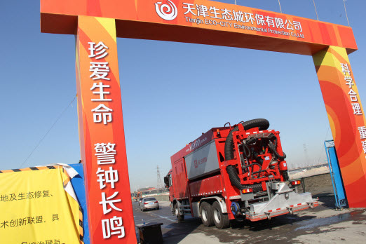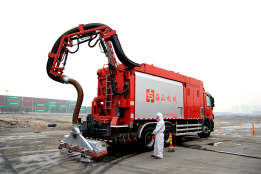 本次施工改變了傳統(tǒng)的由清掃車清掃作業(yè)、灑水車高壓沖洗、多種洗消設(shè)備聯(lián)合作業(yè)的施工模式,由一臺抽吸車即可完成,對污染物的清除率達到現(xiàn)場的環(huán)保施工要求。相對于傳統(tǒng)的作業(yè)方式,全密閉、無拋灑、地表清洗干凈,工作效率提升5倍以上。