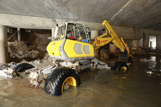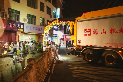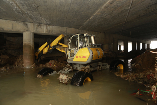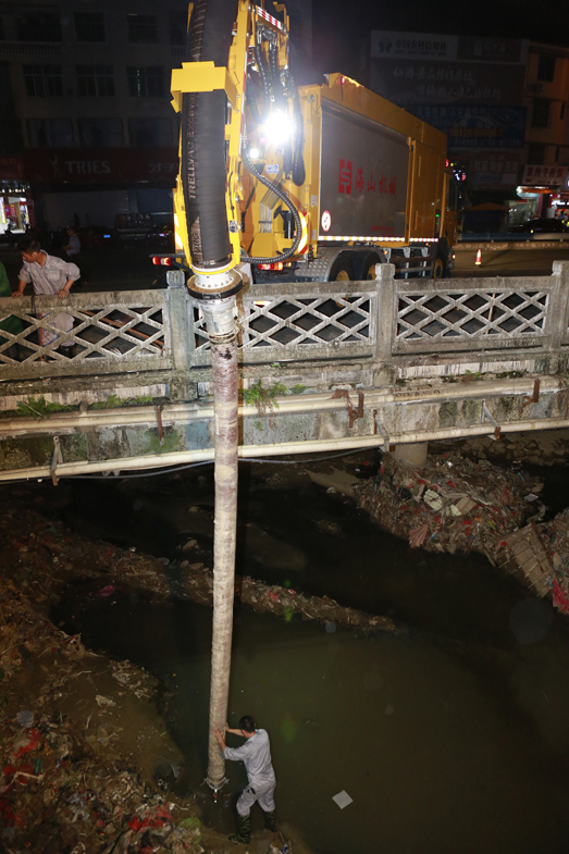 在第14號(hào)臺(tái)風(fēng)“莫蘭蒂”來臨之際,海山機(jī)械緊急出動(dòng)高端應(yīng)急救援裝備——非破壞性挖掘抽吸車和步履工作平臺(tái)趕赴仙游郊尾鎮(zhèn),對(duì)一座大橋下堵塞嚴(yán)重的河道進(jìn)行清理。本次施工運(yùn)用抽吸車和步履工作平臺(tái)聯(lián)合作業(yè),發(fā)揮抽吸車長(zhǎng)距離作業(yè)、強(qiáng)力抽吸和步履的機(jī)動(dòng)靈活、全地形通過、“上山下河”特點(diǎn),解決了普通機(jī)械設(shè)備無法進(jìn)入河道和清理出來的垃圾物無法運(yùn)輸?shù)碾y題。經(jīng)過設(shè)備的緊急挖掘、抽吸疏通,使堵塞嚴(yán)重的河道保持暢通,確保暴雨來臨時(shí)河道水流暢通。
