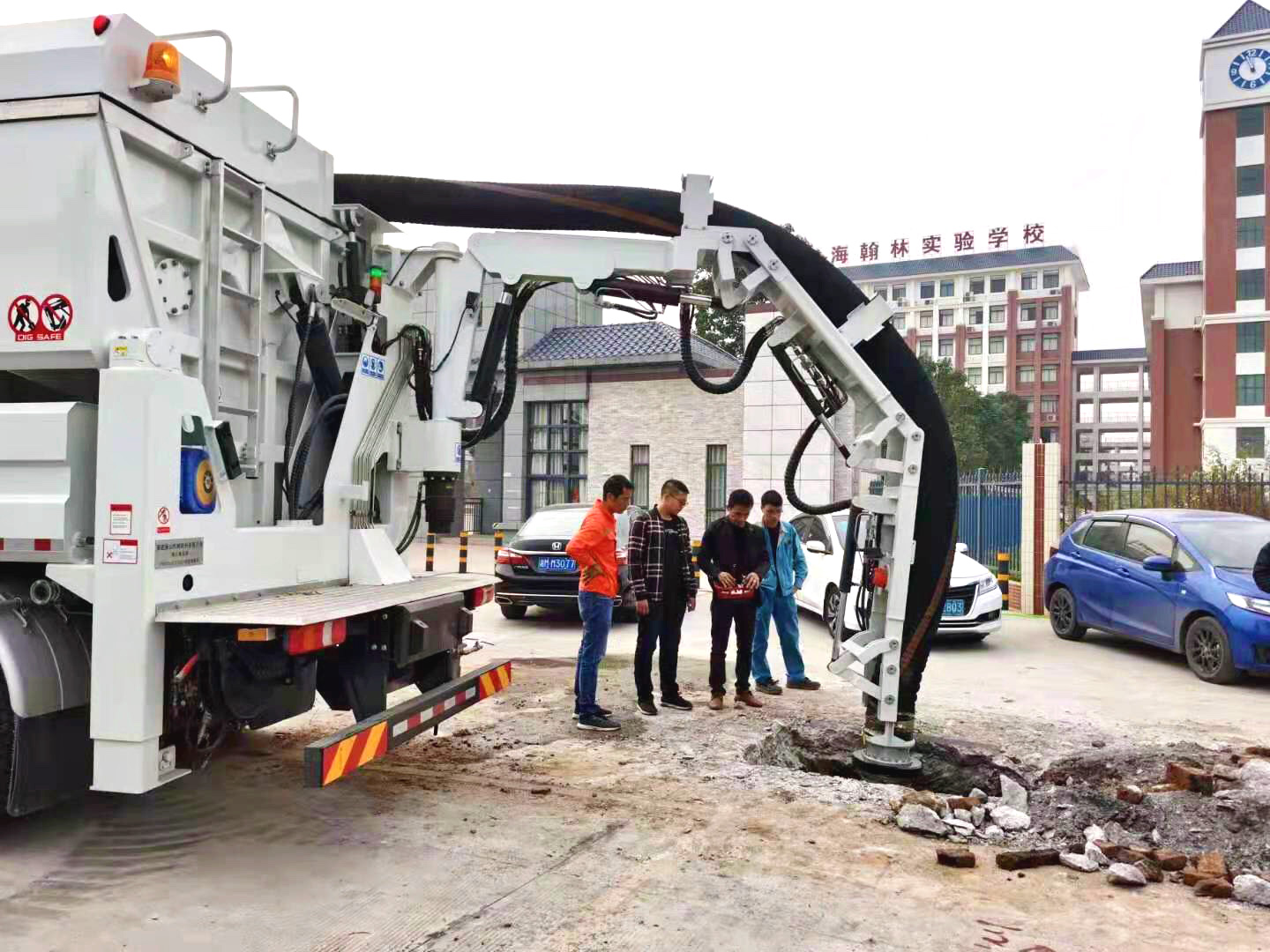 ? 2016 Fuzhou Nibote Flood Rescue: Haishan Multi functional Excavator and Suction Vehicle flexibly responds to narrow alleys, courtyard walls, ditches and other working conditions, can cross ditches and obstacles, efficiently clean up post disaster sites, and also take into account road cleanliness。